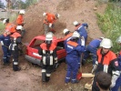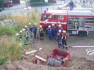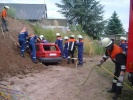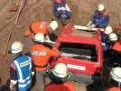 Die Übung wurde gut vorbereitet: Die Front des PKWs steckte tief in einem Erdhügel und beide Personen waren teilweise verschüttet. Der PKW musste also erst freigeschaufelt werden, das war Knochenarbeit. Anschließend wurde das Dach mit Spreizer und Schere entfernt. Ein 70-Kilo-Dummy wurde mittels Rollgliss, welches an der Anhängeleiter befestigt wurde, aus dem Auto gehoben. Natürlich wurde auch für die Verkehrsabsicherung und den Brandschutz gesorgt.