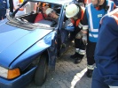 Am Samstag in der Früh um 7 Uhr ging es los. Der Tag ist wie in den vorhergegangenen Jahren wie bei der echten BF in einen engen Zeitplan eingeteilt. Als erstes wurden Jugendlichen per Los auf die Fahrzeuge verteilt und eingewiesen. Gleich danach fand eine kleine Übung zum Löschaufbau statt, die sich am Einsatzort später noch als wichtig erweisen sollte. Kurz nach der Übung rückte das BRK zum ersten Mal aus, eine Bewusstlose Person musste versorgt werden. Bald darauf rückte auch die „BF-Roßtal“ zu ihrem ersten Einsatz an diesem Tag aus: Eine eingeklemmte Person wartete auf ihre Befreiung. Nachdem der tonnenschwere Steinblock per Hebekissen und Seilwinde vom Verunfallten gestemmt wurde, konnte er dem BRK übergeben werden, die sich fürsorglich um ihren Patienten kümmerten.
