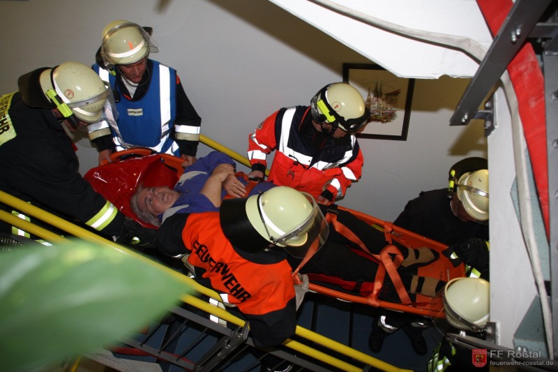 Die Zusammenarbeit zwischen Feuerwehr und Rettungsdienst verlief sehr gut - hier bei der Evakuierung eines Bewohners mit der Schleifkorbtrage
